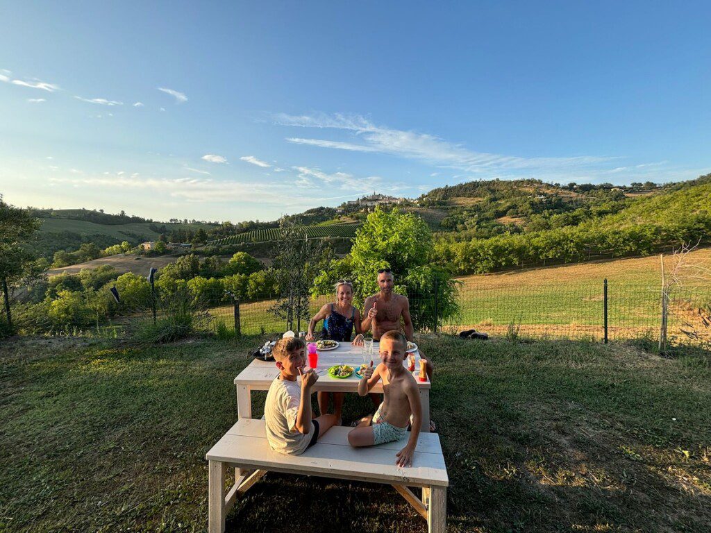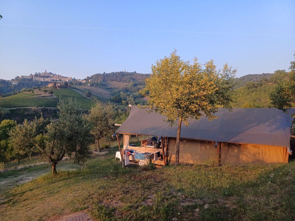 In de heuvels van De Marken in Midden-Italië ligt Agricampeggio Tasteria, een kleinschalige agriturismo. Hier word je wakker met 360° uitzicht over het glooiende landschap en de rust van het Italiaanse platteland. Vanuit je luxe glampingtent kijk je uit over de velden en olijfbomen, terwijl de kinderen spelen op het terrein of een duik nemen in het zwembad.