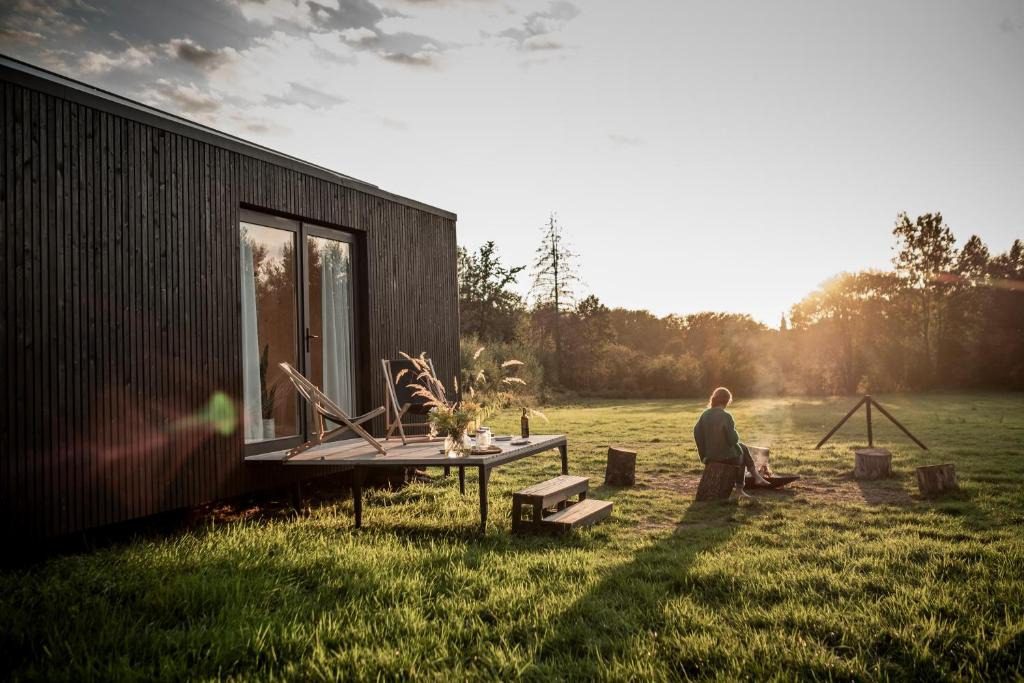 De duurzame cabin is geschikt voor twee tot drie personen. Het is voorzien van een zithoek met keuken, een comfortabel tweepersoonsbed en een badkamer.