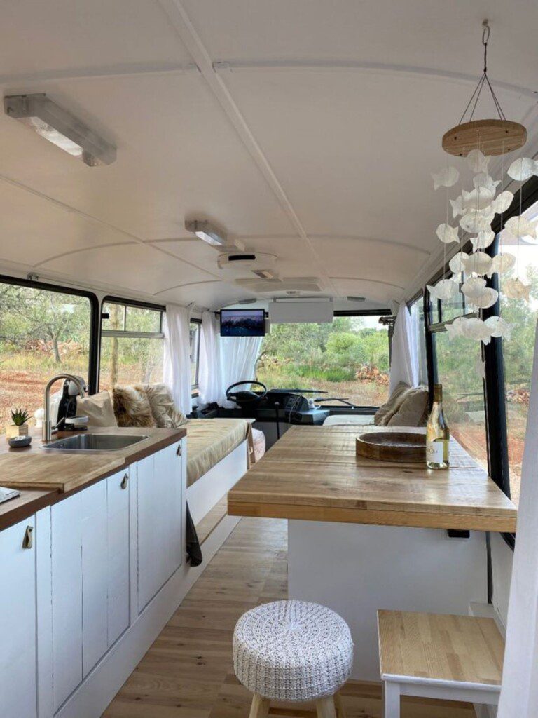 Deze stijlvolle omgebouwde schoolbus beschikt over zes slaapplekken, een volledig ingerichte keuken, een zithoek en badkamer met douche en toilet.