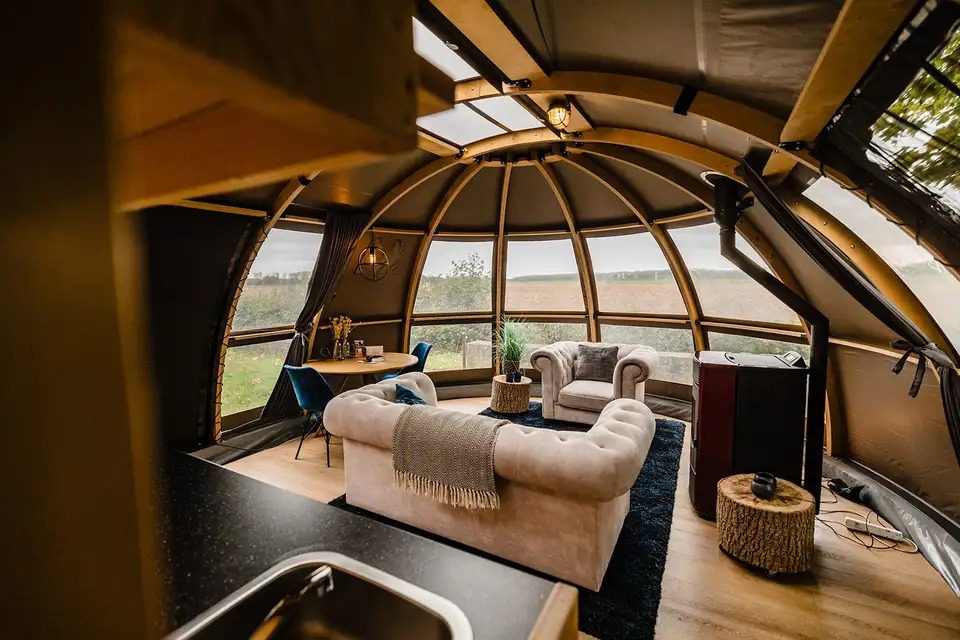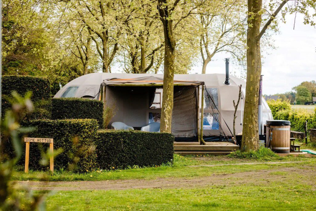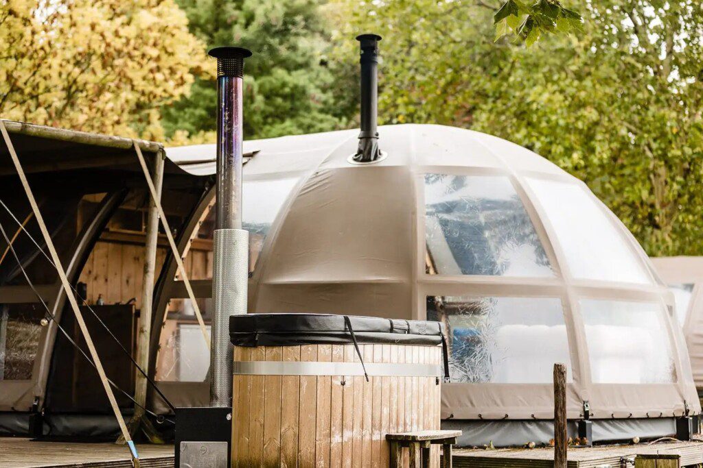De ruim opgezette Dome staat midden in de natuur en is geschikt voor maximaal twee personen. Het beschikt over een tweepersoonsbed, een badkamer en een leefruimte met keukenblok en pelletkachel.